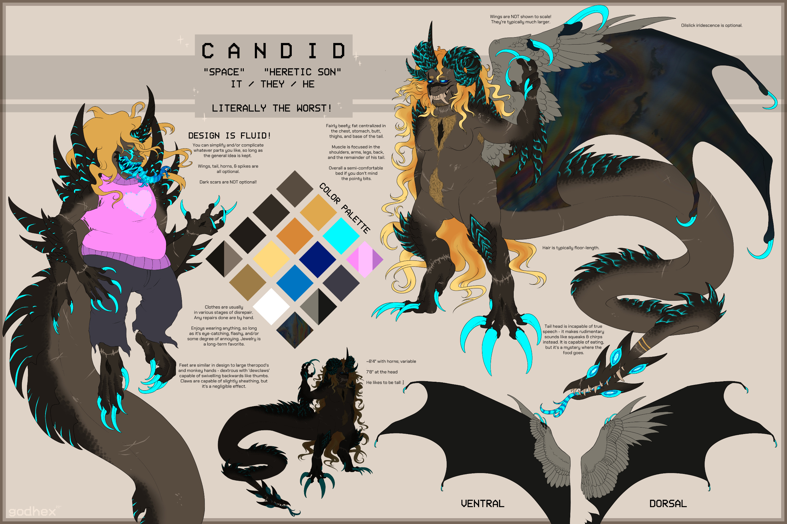 TRAITS. Over seven feet, large. 300+ lbs usually. Thick core, more muscle than fat. Dark, dead-looking complexion, darkens towards the end of extremities. Inhuman eyes, bright cyan, glows, intact tapetum lucidum. Hair is curly and wild, blond. Has long claws, cyan in color. Large crooked teeth and a long frayed tongue. Tail has crocodilian-like plating with spikes. Body is covered in scars. Dirty overall typically.