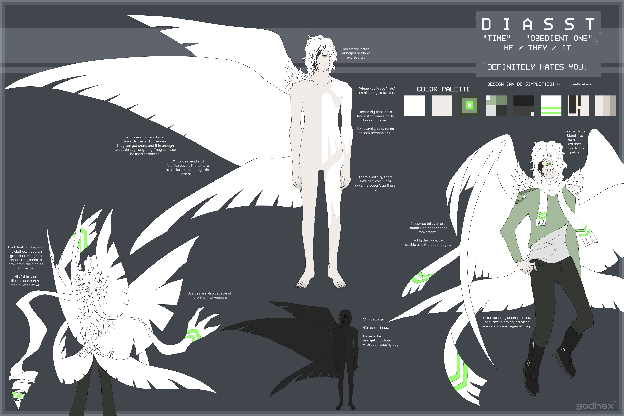 TRAITS. Under five feet, small. >60 lbs usually. Thin and lithe. Nearly pure white complexion, slight green tint over joints. Inhuman eyes, bright green, glows, intact tapetum lucidum. Hair is slightly curled, covers right eye, white. Right side of his face is covered in deep, black scars. Has three pairs of angelic wings. Always wearing two scarves. Impeccably clean at all times.